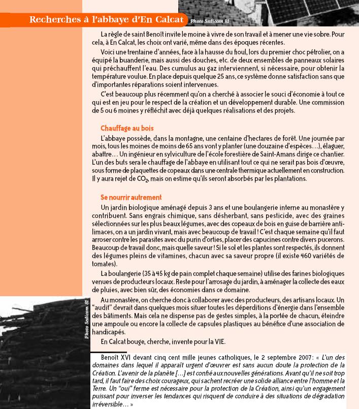 Dans un document publié par le diocèse d’Albi il y a quelques temps sur la nécessaire conversion écologique, je repère cette page qui évoque les réflexions et actions en cours du monastère d’En-Calcat. Une tendance à suivre au sein de ces communautés, dont la tradition comporte une vraie attention au cadre naturel qui les accueille…
