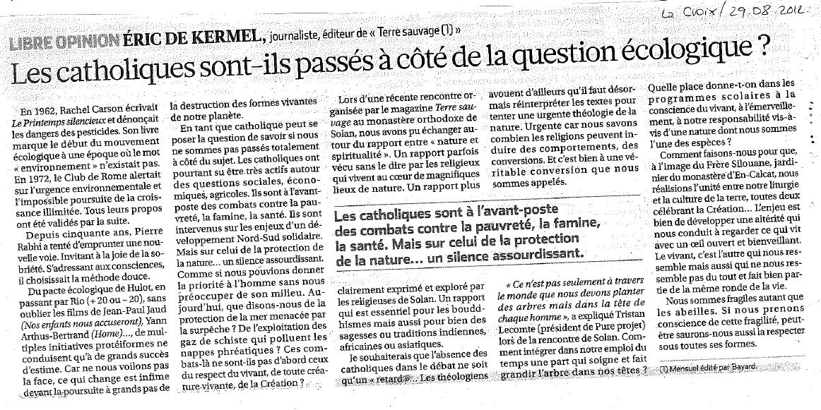 Un autre article encore, paru celui-ci dans le journal La Croix du 29 août. Il s’agit en fait d’une réflexion proposée par Eric de Kermel, directeur de la revue Terre sauvage et passionné de la question de la nature. Suite à une rencontre organisée récemment au monastère de Solan (Gard) autour des enjeux de la rencontre entre les acteurs de la nature et ceux de la spiritualité, il s’interroge sur le retard du monde catholique dans la mobilisation écologique actuelle.
