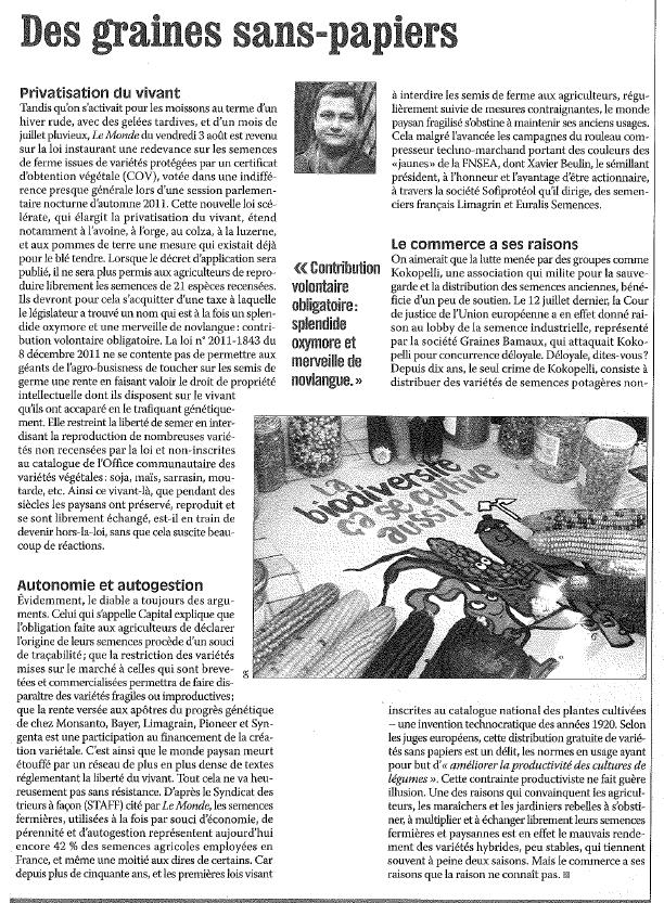 Une chronique récente (30 aout 2012 ; n° 3504) de la revue Témoignage chrétien aborde la loi votée il y a peu à propos des semences en France. Certaines associations chrétiennes d’agriculteurs dénoncent déjà de longue date ces manœuvres autour des semences.