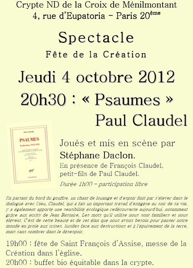la Terre invitent pour une soirée clôturant le mois de prière pour la Création, à l’occasion de la saint François d’Assise. On pourra y entendre les « psaumes » dans la version de Paul Claudel, dont la sensibilité à la beauté de la Création mérite d’être redécouverte.