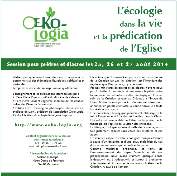 Encore une bonne nouvelle. Les amis d’Oekologia ont visiblement passé la vitesse supérieure. Voici qu’ils nous annoncent l’organisation d’une session pour prêtres et diacres, du 24 au 26 août 2014.