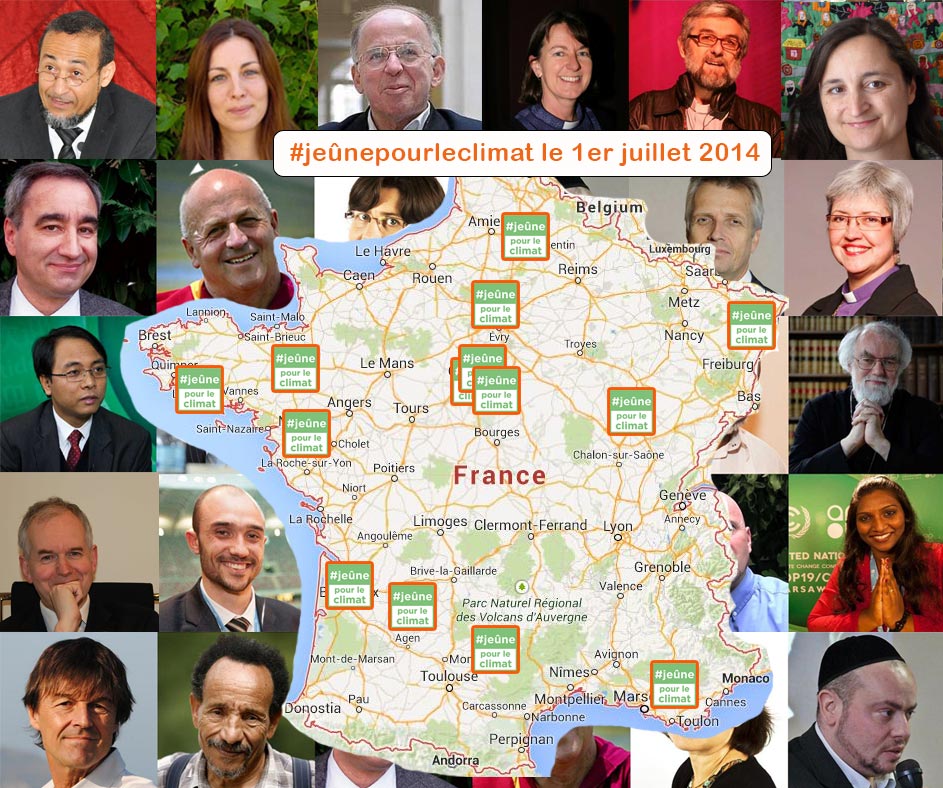 En ce 1e juillet 2014, comme des centaines d’autres personnes, toutes confessions confondues, ils ont commencé le jeûne pour le climat. Ils le pratiqueront chaque premier jour du mois jusqu’aux négociations climatiques de décembre 2015, qui auront lieu à Paris. Treize autres rassemblements ont eu lieu en France ce 1e juillet, dans des lieux tels qu’un temple protestant à Orléans, un presbytère à Sautron, près de Nantes ou chez un particulier à Bordeaux. Les rassemblements se veulent interreligieux. A Arras, il aura lieu le 3 juillet et réunira dans un temple protestant l’évêque du diocèse, des personnes de confession musulmane, des élus locaux, un député européen, etc.