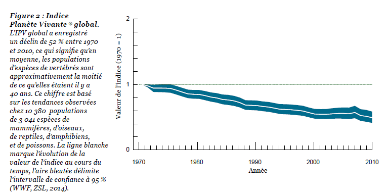 L’Indice Planète Vivante global a enregistré un recul de 52 % entre 1970 et 2010. À cause du changement de méthodologie mis en place pour mieux prendre en compte les tailles relatives de chaque groupe d’espèces dans les divers biomes, ce pourcentage s’est considérablement abaissé par rapports aux publications précédentes.