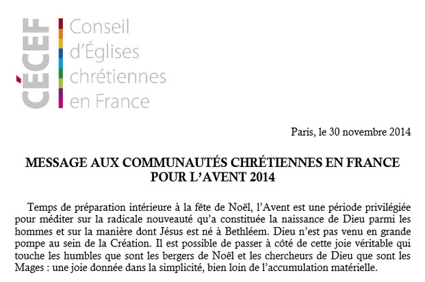 MESSAGE AUX COMMUNAUTÉS CHRÉTIENNES EN FRANCE. POUR L’AVENT 2014