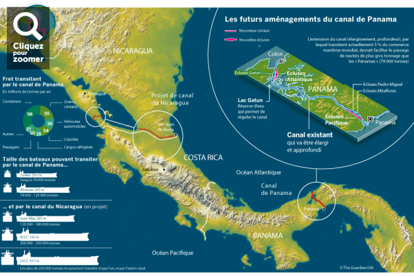 Mais d’où vient en fait ce projet de canal ? Il est ancien, aussi ancien que celui du Panama qui, lui, est une chasse gardée des Etats-Unis. Avec l’avantage de raccourcir encore le passage de la côté est à la côte ouest des Etats-Unis et de permettre le passage de supertankers de 250 000 tonnes, loin devant les capacités du canal de Panama, malgré les travaux d’élargissement en cours. Ce potentiel, ce sont les Chinois qui l’ont repéré, pariant sur une augmentation du trafic maritime commercial de 240 % d’ici 2030. C’est donc au sein des discussions menées par les pays de la coalition des BRICS (Brésil, Russie, Inde, Chine, Afrique du Sud) que le projet a été décidé, soutenu par la Chine et la Russie essentiellement. En juin 2014, une concession de 50 ans avait été accordé par le président nicaraguayen à la Hongkong Nicaragua Canal Development (HKND). Le projet devrait être achevé en 2019 pour une entrée en fonction une année plus tard. Ce canal de 278 km de long, bien plus grand et large que ceux de Suez ou de Panama, pourrait bien capter jusqu’à 5 % du commerce mondial, là où celui du Panama n’en capte actuellement que 3 %. De plus, le canal sera doublé par une voie ferroviaire et la construction d’un aéroport, de ports et d’un oléoduc. De quoi doper le PIB du Nicaragua et de booster le marché de l’emploi.