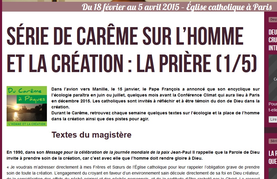 Premier signe d’une mobilisation des diocèses d’Île-de-France pour le prochain sommet sur le climat à Paris ? Le site diocésain de Paris annonce le lancement d’une série de Carême, sur « L’homme et la Création », du 18 février au 5 avril 2015.