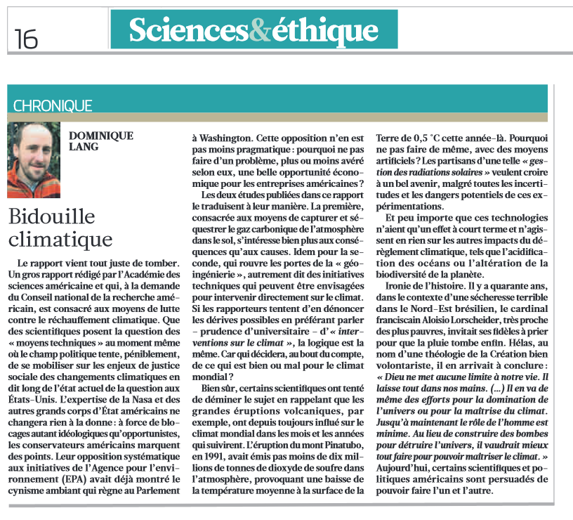 Pour ceux qui seraient frustrés, voici donc une séance de rattrapage avec une copie du texte que vous n’avez pas pu lire hier. Où il est question de climat, d’ingénieurs sans mesure et d’évêque brésilien trop volontariste…