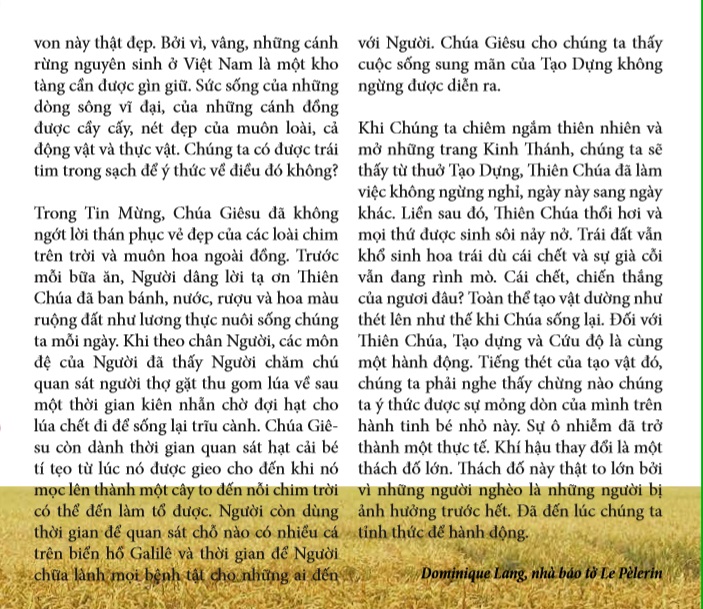 Pas tous les jours qu’on écrit en vietnamien (enfin, qu’on est traduit en vietnamien). A l’occasion d’un rassemblement de jeunes chrétiens à Saigon (Saigon Youth day), un livret était proposé contenant plusieurs éléments de réflexions spirituelles, dont un texte sur l’écologie…