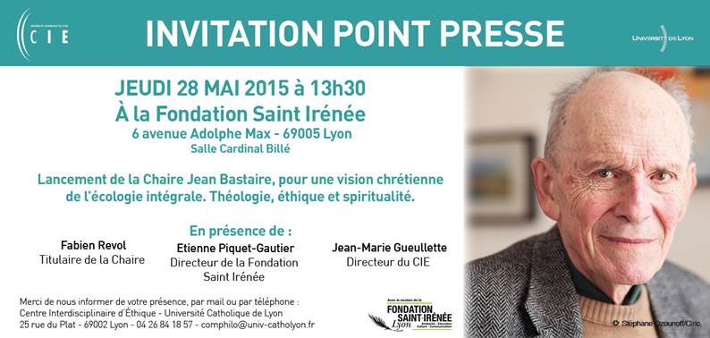 Le Centre Interdisciplinaire d’Éthique (CIE) de l’Université Catholique de Lyon, a inauguré en janvier 2015 la Chaire Jean Bastaire, pour une vision chrétienne de l’écologie intégrale, théologie, éthique et spiritualité. Cette journée permet de lancer officiellement cette Chaire, financée, pour cinq ans, par la Fondation Saint-Irénée du diocèse de Lyon.Cette journée d’hommage à Jean Bastaire se propose d’évoquer les points forts de cette pensée aux dimensions du cosmos et de cette éthique de la joie dans l’accueil de nos limites. Animée par Jean-Marie Gueulette, directeur du CIE, elle verra se succéder dès 14h00, différents intervenants pour parler du travail et des projets de Jean Bastaire dans sa visée à la fois chrétienne et écologique.