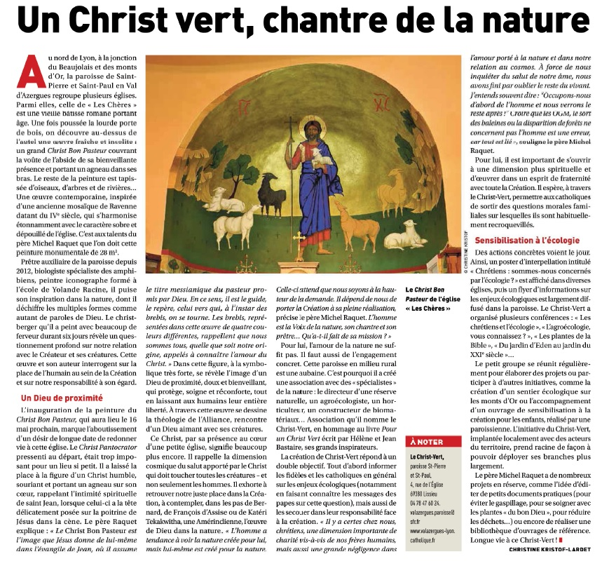 Michel est aussi membre de la chaire Jean Bastaire au titre d’enseignant-chercheur en biologie à l’Ucly. Sur sa paroisse, il a créé ce groupe appelé « Christ-Vert » qui rassemble des professionnels du monde de la nature (directeur du parc de la Feyssine, paysagiste, bioconstruction, pépiniériste…). C’est aussi lui qui a réalisé une peinture murale inaugurée le 16 mai dernier, sur le thème du « bon Pasteur ». On pourra rencontrer Michel pour en savoir plus aux prochaines Assises chrétiennes de l’écologie à Saint-Etienne.