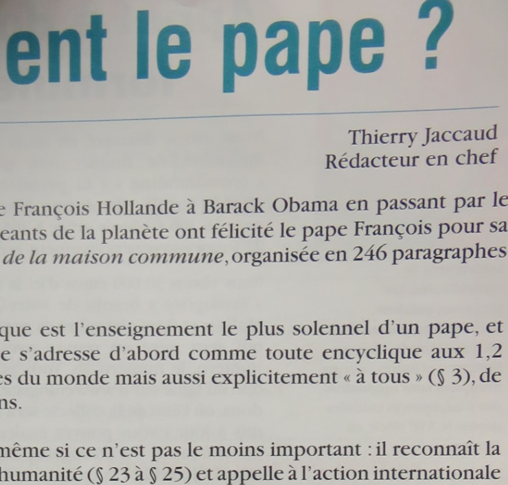 Arnaud m’envoie un document scannée de l’éditorial du dernier numéro de L’écologiste. Son rédacteur en chef y fait une lecture passionnante de l’encyclique du pape.