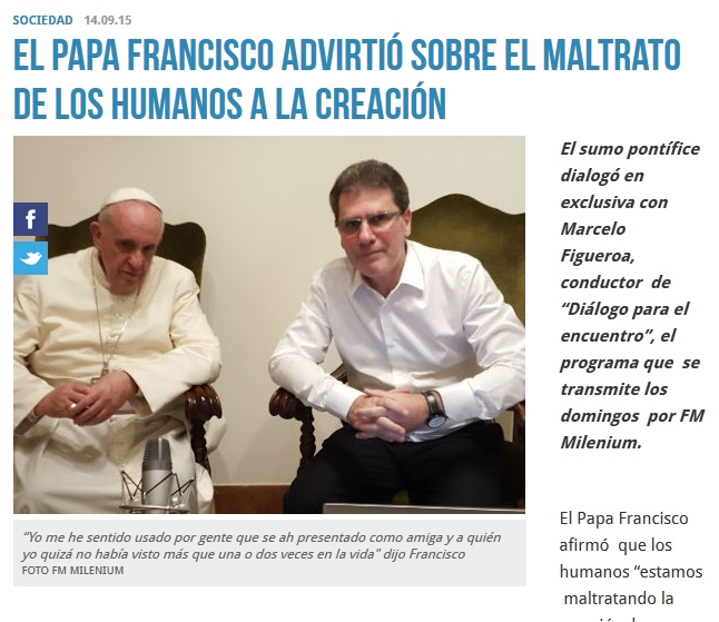 Ce 14 septembre, le pape François accordait un entretient à Marcelo Figueroa, animateur de l’émission « Dialogue et rencontre » de la radio argentine Milenium, au sujet de la protection de la Création et de la valeur de l’amitié et du dialogue.Il y évoque son regard sur la déforestation dramatique, les monocultures de maïs qui détruisent les sols, les barrages qui font violence aux populations indigènes etc.