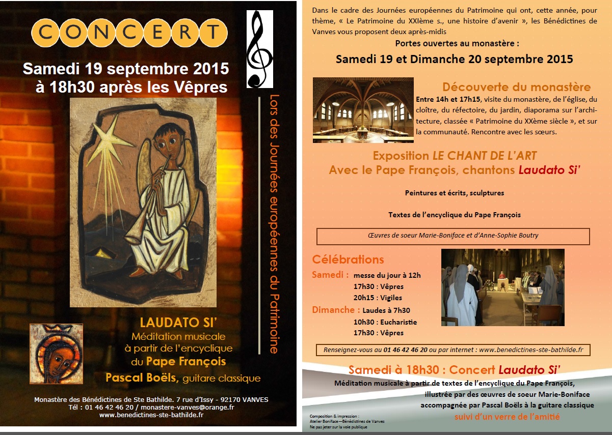Ce concert autour de l’encyclique Laudato si’ se déroule au terme d’une journée « portes ouvertes » dans le monastère. Une exposition « Le chant de l’art » y donnera déjà le ton avant ce concert qui se déroulera le 19 septembre, à 18 h 30 après les Vêpres.