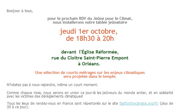 Les amis de Chrétiens et Ecologie dans le Loiret se retrouvent, comme chaque premier jour du mois, pour le jeûne pour le climat. A noter que de telles rencontres ont lieu un peu partout à travers la France. Dans le XIVe arrondissement, par exemple, la rencontre a lieu dans les locaux de Pax Christi France (5 rue Morère, 75014)