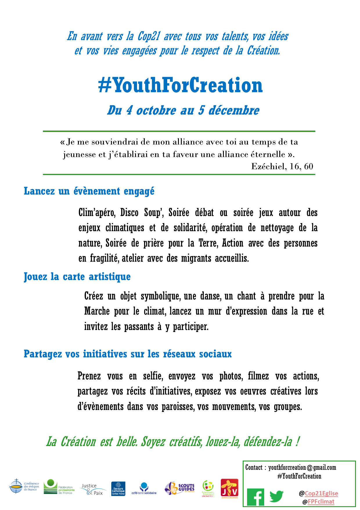 On vous invite dimanche 4 octobre, Journée de la Création, à tweeter largement en utilisant le hashtag #YouthForCreation pour lancer le Défi des Jeunes pour le Climat ! Mobilisez votre réseau et les jeunes que vous connaissez !