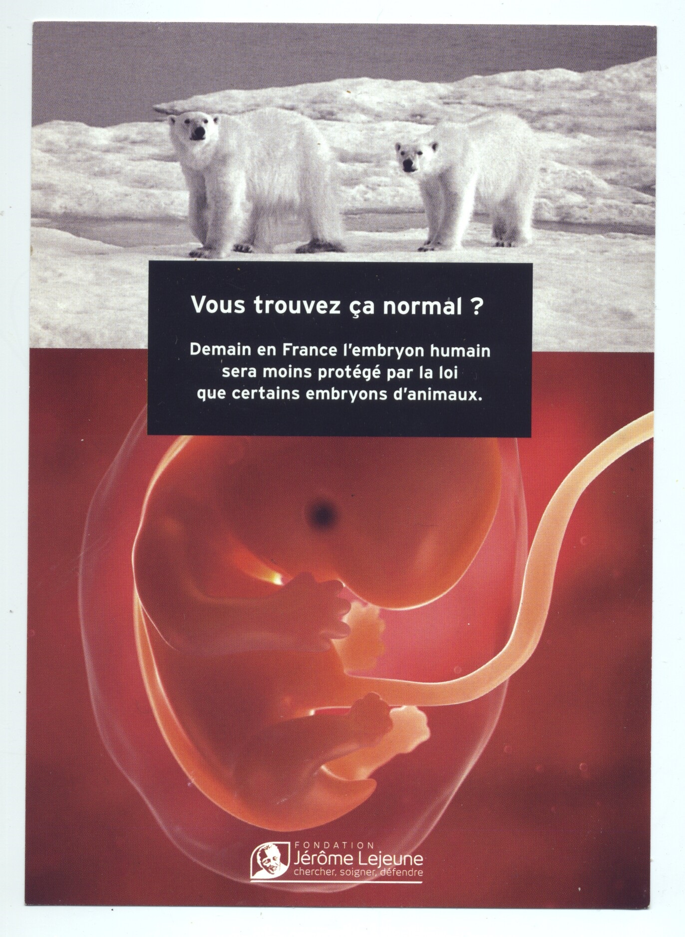 Damien, de l’association C.OR.E, me signale cette campagne publicitaire de la Fondation Lejeune, à propos d’un projet de loi étudié par le Sénat français «autorisant la recherche sur l’embryon humain et les cellules souches embryonnaires humaines ». Un cas d’école pour évoquer l’implicite, publicitairement facile (ah, les fameux ours polaires) et éthiquement discutable, entre diverses formes de vivant sur cette planète.