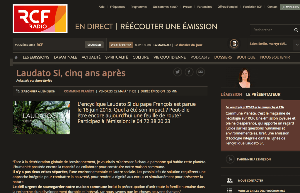 Anne, qui anime l’émission « Commune planète » sur RCF vous invite ce soir à 17 h à participer à la réflexion autour des enjeux de l’encyclique Laudato si. On s’y retrouve ?