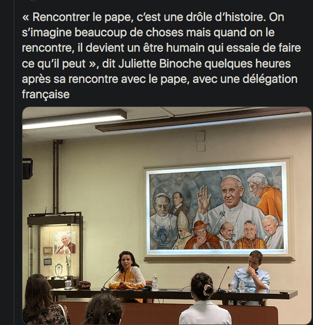 L’actrice Juliette Binoche, qui est marquée par le Dialogue avec l’ange (un livre qu’elle a offert au pape) raconte :