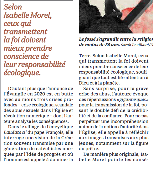 Dans le journal La Croix est présenté l’ouvrage « Transmettre la foi en temps de crise » d’Isabelle Morel. Une réflexion qui aborde aussi la place de l’annonce de la Création comme parent pauvre de la catéchèse aujourd’hui.