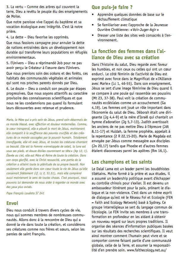 Parmi les documents utilisables pour les célébrations dominicales de ce mois de prière, on peut signaler l’intéressant travail d’un prêtre australien, Charles Rue, de la Société missionnaire de Saint Colomban. L’association Oecu Eglise et environnement en a assuré la traduction.