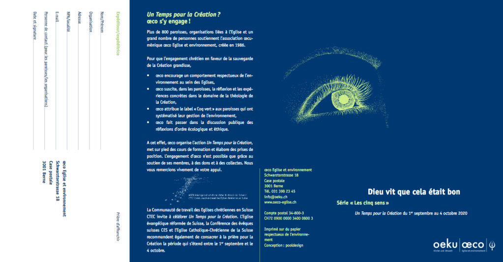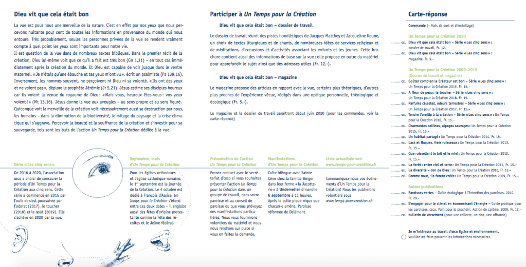 L’association suisse Oeku/oeco Eglise et environnement poursuit la mobilisation déjà ancienne (depuis 1986) des communautés chrétiennes du pays sur les enjeux environnementaux. Voici leur dernière campagne pour la période « Un temps pour la Création ».