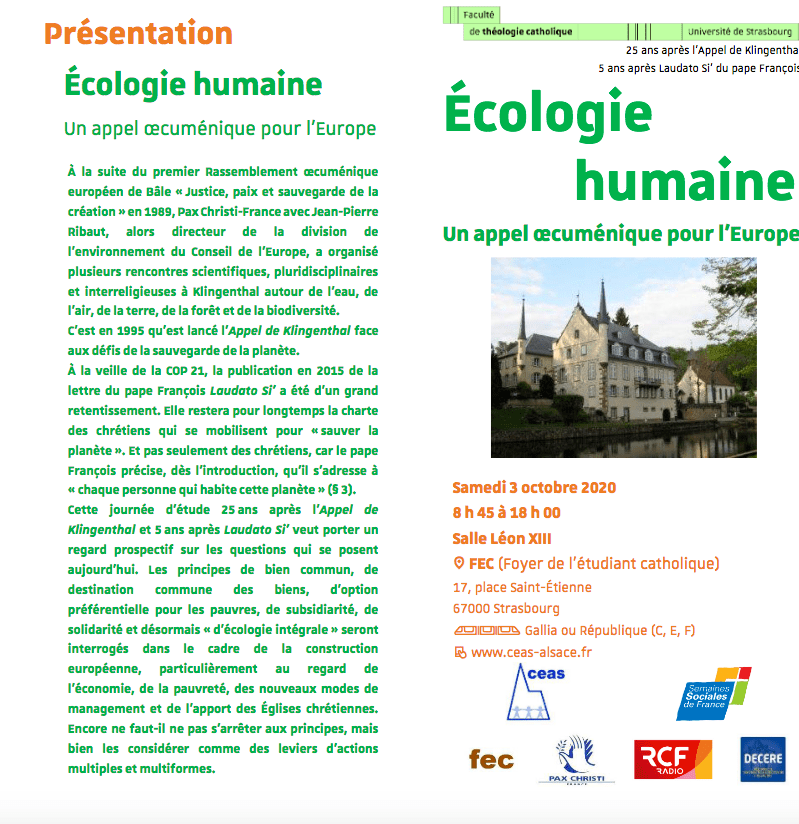 À la suite du premier Rassemblement œcuménique européen de Bâle «Justice, paix et sauvegarde de la création» en 1989, Pax Christi-France avec Jean-Pierre Ribaut, alors directeur de la division de l’environnement du Conseil de l’Europe, a organisé plusieurs rencontres scientifiques, pluridisciplinaires et interreligieuses à Klingenthal autour de l’eau, de l’air, de la terre, de la forêt et de la biodiversité. C’est en 1995 qu’est lancé l’Appel de Klingenthal face aux défis de la sauvegarde de la planète. À la veille de la COP21, la publication en 2015 de la lettre du pape François Laudato Si’ a été d’un grand retentissement. Elle restera pour longtemps la charte des chrétiens qui se mobilisent pour «sauver la planète». Et pas seulement des chrétiens, car le pape François précise, dès l’introduction, qu’il s’adresse à «chaque personne qui habite cette planète» (§3). Cette journée d’étude 25 ans après l’Appel de Klingenthal et 5 ans après Laudato Si’ veut porter un regard prospectif sur les questions qui se posent aujourd’hui. Les principes de bien commun, de destination commune des biens, d’option préférentielle pour les pauvres, de subsidiarité, de solidarité et désormais « d’écologie intégrale » seront interrogés dans le cadre de la construction européenne, particulièrement au regard de l’économie, de la pauvreté, des nouveaux modes de management et de l’apport des Églises chrétiennes. Encore ne faut-il ne pas s’arrêter aux principes, mais bien les considérer comme des leviers d’actions multiples et multiformes.