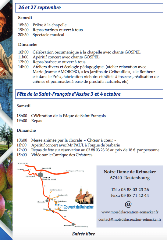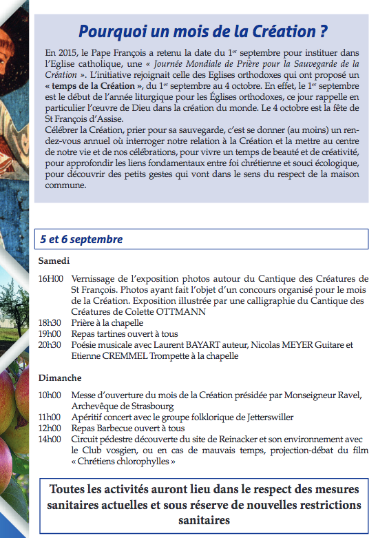 Le programme se construit autour d’une animation sur les WE de ce mois de prière pour la Création