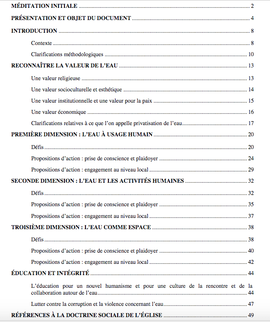 En effet, le document Aqua fons vitae mérite d’être découvert ainsi que le recueil de documents sur ce thème si important pour l’avenir. Pour rappel, voici le plan du document AFV