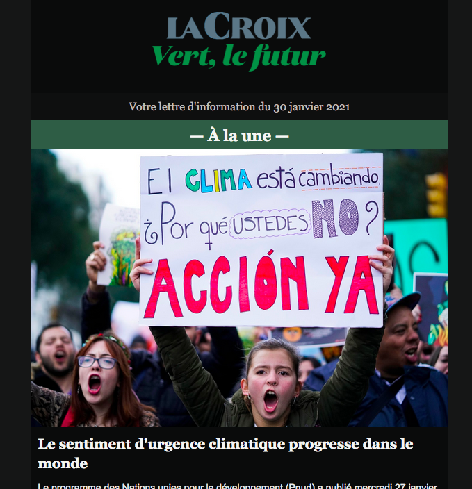 Actualité, articles MEDIA – Quand La Croix passe au vert Publié par dlang le 1 février 2021 Le quotidien La Croix vient de lancer une nouvelle lettre d’information dédiée spécifiquement aux informations sur les questions environnementales. A découvrir !! Partager : Cliquer pour partager sur X(ouvre dans une nouvelle fenêtre) X Cliquez pour partager sur Facebook(ouvre dans une nouvelle fenêtre) Facebook Cliquer pour imprimer(ouvre dans une nouvelle fenêtre) Imprimer Cliquez pour partager sur Pocket(ouvre dans une nouvelle fenêtre) Pocket Cliquez pour partager sur WhatsApp(ouvre dans une nouvelle fenêtre) WhatsApp J’aime chargement… Similaire