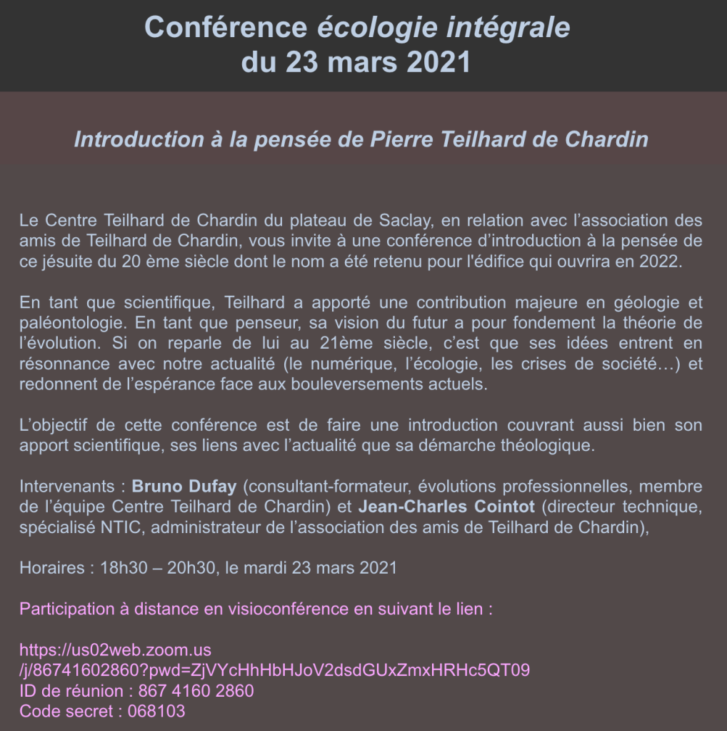 Une prochaine conférence permettra de faire mieux connaissance avec ce jésuite scientifique qui a renouvelé la perception de cette relation entre le monde scientifique moderne et l’expérience chrétienne, le P. Teilhard de Chardin