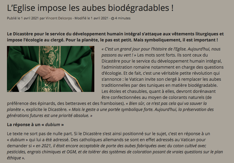 Actualité, Ecologie intégrale EXERCICE – Aube nouvelle Publié par dlang le 14 avril 2021 En ces temps surinformés, un petit exercice de lecture. Vous avez 3 mn pour vous faire un avis. Un article paru sur cathobel Vous aurez bien noté la date de l’article publié sur un site diocésain belge. Un peu d’humour n’a jamais fait de mal à personne. Partager : Cliquer pour partager sur X(ouvre dans une nouvelle fenêtre) X Cliquez pour partager sur Facebook(ouvre dans une nouvelle fenêtre) Facebook Cliquer pour imprimer(ouvre dans une nouvelle fenêtre) Imprimer Cliquez pour partager sur Pocket(ouvre dans une nouvelle fenêtre) Pocket Cliquez pour partager sur WhatsApp(ouvre dans une nouvelle fenêtre) WhatsApp J’aime chargement… Similaire
