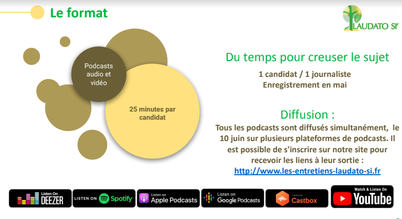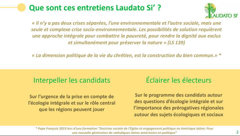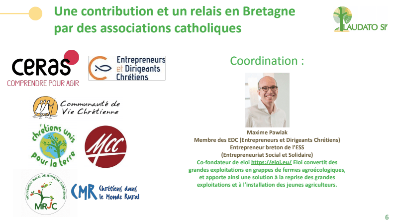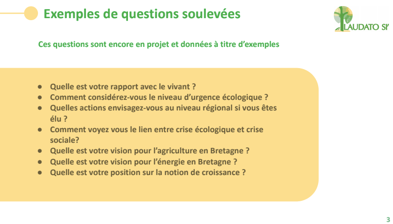 Nous avons 6 candidats confirmés, et une belle dynamique pour la diffusion, auprès des EDC, MCC, CUT, CVx, MRJC, et CERAS, grâce à vous tous qui représentez ces associations. (…) Pour rappel, l’objectif affiché est, dans le cadre des élections régionales en Bretagne, d’interpeller les candidats et d’éclairer les électeurs à la lumière de l’écologie intégrale. (…) Nous cherchons toujours un ou plusieurs journalistes Bretons qui accepteraient de réaliser des interviews, si vous pouvez relayer ou nous transmettre des contacts nous sommes preneurs ! (interviews de 30 minutes en visio à faire en mai, connaissance ou préparation nécessaire sur Laudato Si’ et / ou le contexte politique Breton) Enfin nous souhaitons organiser une visio pour échanger sur le fond des entretiens, à savoir les questions posées aux candidats et les briefings qui leur seront transmis ainsi qu’aux journalistes. Cette visio aura lieu le 7 mai à 17h.