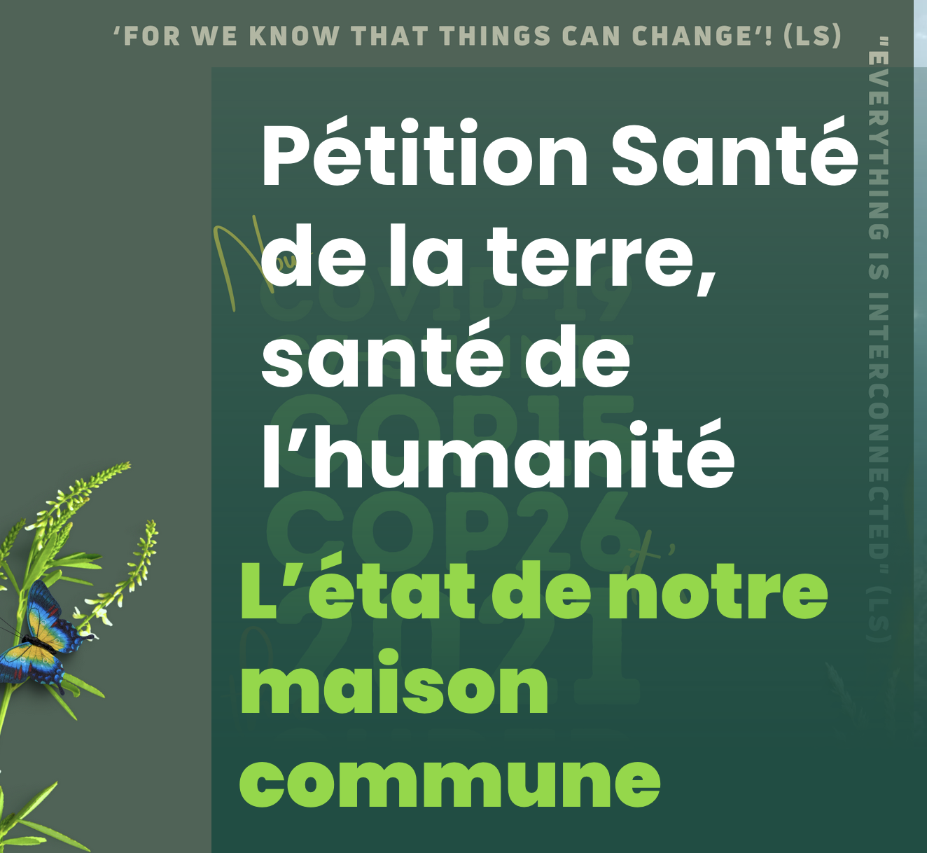 Notre maison commune et notre famille commune souffrent. L’urgence climatique engendre une montée du niveau des mers, un réchauffement de la planète et une augmentation des conditions météorologiques extrêmes. Ceci ravage la vie de nos sœurs et frères les plus pauvres. En parallèle, les biologistes estiment que les activités humaines sont la cause d’une extinction des espèces allant de 100 à 1000 fois plus vite que le cycle naturel. «Nous n’en avons pas le droit» (Laudato Si ’33).Nous avons une opportunité unique. Lors de la Conférence des Nations Unies sur la biodiversité (COP15) en octobre, les dirigeants mondiaux peuvent fixer de véritables objectifs pour protéger la création. En novembre, lors de la 26e Conférence des Nations Unies sur les changements climatiques (COP26), les pays dévoileront leurs plans pour atteindre les objectifs de l’accord de Paris. En amont de ces rencontres, il est de notre responsabilité en tant que chrétiens de faire entendre la voix des plus vulnérables et de défendre leur cause. Nous devons agir maintenant.
