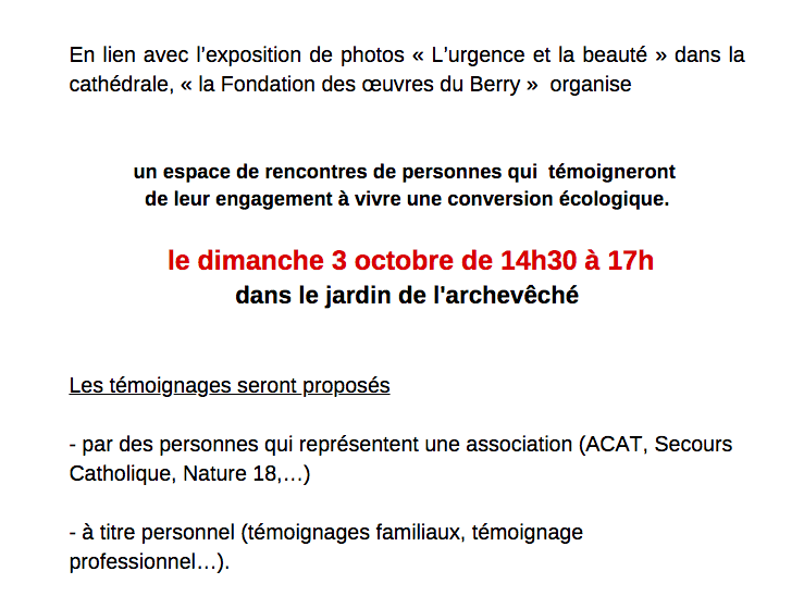 La Fondation des œuvres du Berry, présidée par Mgr Jérôme Beau, archevêque de Bourges organise une exposition de photographies et une conférence débat sur le thème de l’écologie à la cathédrale de Bourges.