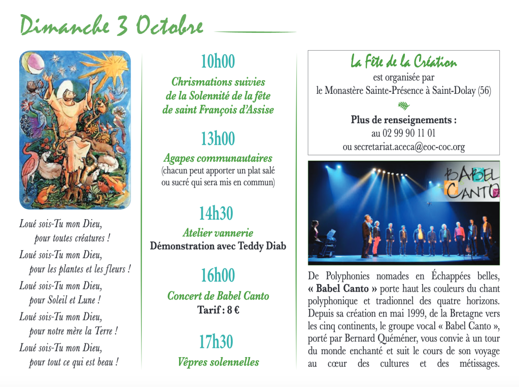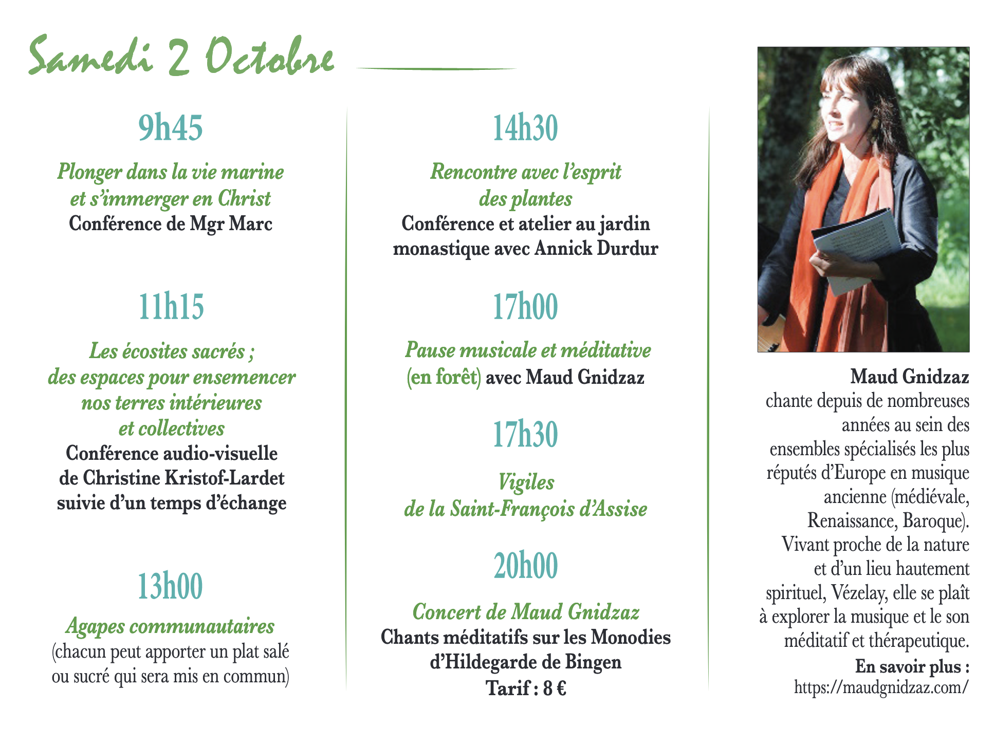 Actualité, Rendez-vous RENCONTRE – La fête à François Publié par dlang le 23 septembre 2021 Parmi les RV à venir pour la fête de la Saint François d’Assise, Christine me signale ce qui se prépare du côté du monastère de la Sainte-Présence, d’obédience orthodoxe celtique, en Bretagne. Partager : Cliquer pour partager sur X(ouvre dans une nouvelle fenêtre) X Cliquez pour partager sur Facebook(ouvre dans une nouvelle fenêtre) Facebook Cliquer pour imprimer(ouvre dans une nouvelle fenêtre) Imprimer Cliquez pour partager sur Pocket(ouvre dans une nouvelle fenêtre) Pocket Cliquez pour partager sur WhatsApp(ouvre dans une nouvelle fenêtre) WhatsApp J’aime chargement… Similaire