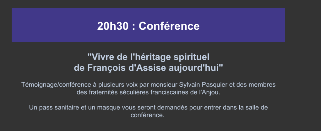L’amie Florence me signale une belle soirée à l’occasion de la Saint François d’Assise à Angers, avec les soeurs franciscaines de l’Esvière, Fondacio et la Frat franciscaine locale.