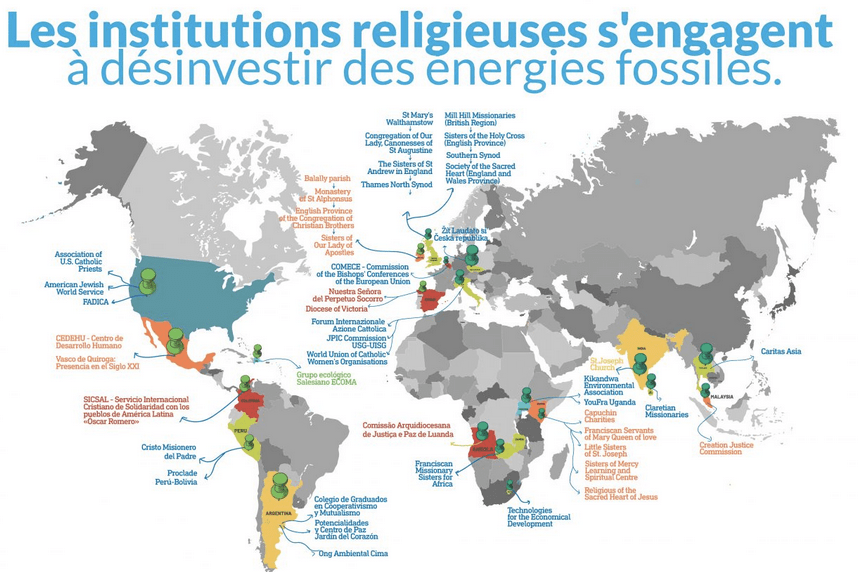 Le plus étonnant est que les institutions religieuses ont été pour une fois à l’avant-garde de ce mouvement, représentant plus de 35 % du total des engagements. Dès 2018, le Secours Catholique-Caritas France, s’y est engagé. Depuis, l’association a modifié ses investissements pour les concentrer sur l’économie sociale et solidaire (ESS). Elle fait partie des 165 membres de la confédération Caritas Internationalis qui avait également annoncé, en 2018, sa décision de désinvestir des énergies fossiles.