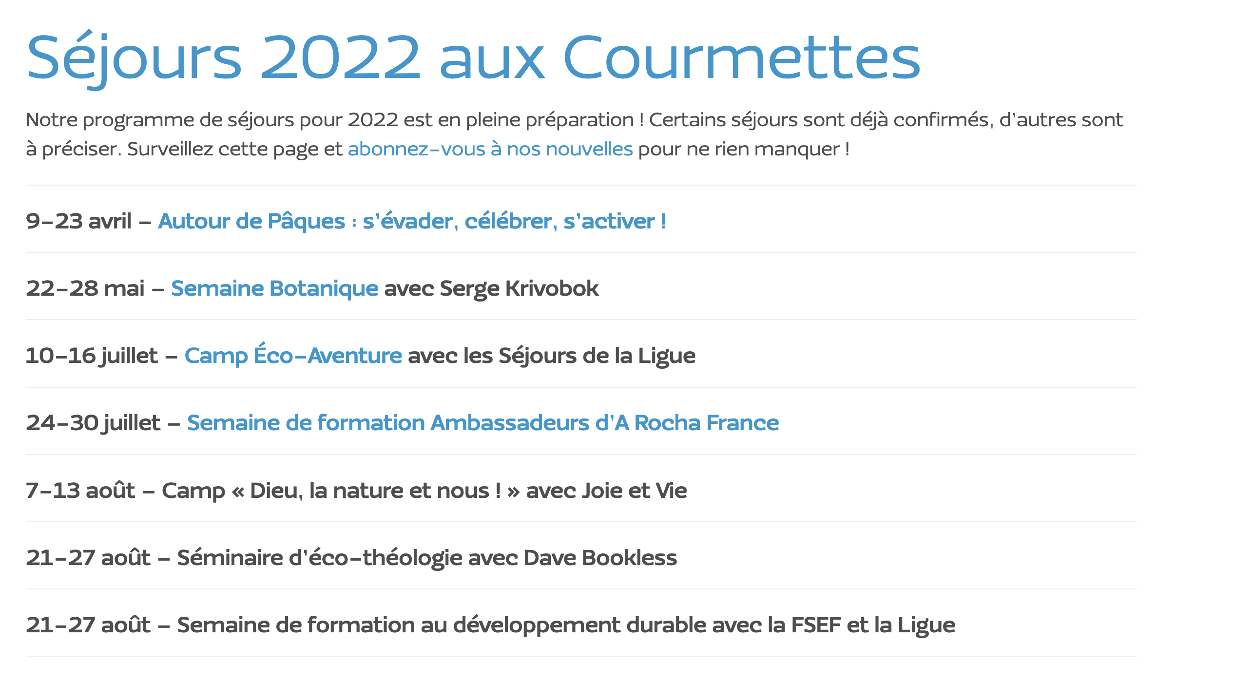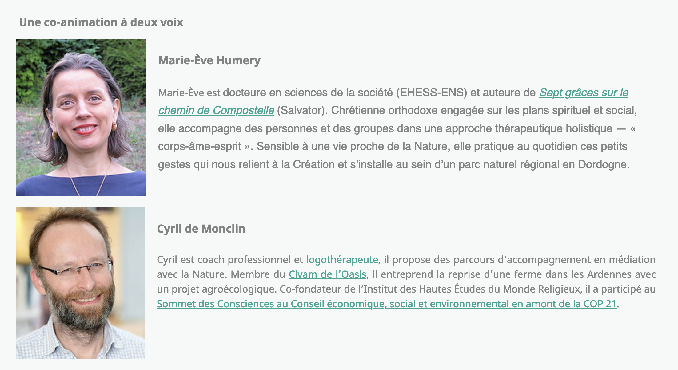 Une retraite spirituelle organisée au sein de l’abbaye cistercienne d’Echourgnac du 21 au 24 avril 2022. Les deux intervenants – un coach, Cyril de Monclin et une thérapeuthe orthodoxe, Marie-Eve Humery proposent un séjour sur le thème : « Comment cheminer — corps-âme-esprit — avec nos questions existentielles, pour honorer notre relation à la Nature et à Dieu ? » : « Il s’agit d’initier un changement humain personnel, qui puisse nous ouvrir à la rencontre avec l’œuvre de Dieu dans sa Création, à l’heure où nous mesurons l’ampleur de notre impact sur l’environnement. Cette retraite est ouverte à toute personne souhaitant « faire sa part » dans cette prise de conscience et cette transformation, pour s’accomplir en jardinier responsable dans le jardin de la Création. Nous sommes, en tant qu’humanité, entrés dans un temps qui nous appelle à une transformation intérieure, à une conversion spirituelle. C’est le constat fait par l’encyclique Laudato si avec nombre d’autres prises de parole, qui affirment que la destruction de la Nature, notre « maison commune », expose gravement les plus vulnérables et pauvres d’entre nous, tout autant que notre santé mentale, émotionnelle et spirituelle, mais aussi notre survie en tant qu’humanité.Les ateliers proposés alterneront travaux personnels et en petits groupes, avec des apports anthropologiques et spirituels des sources bibliques, ainsi que la participation aux offices des moniales et à leurs travaux agricoles.