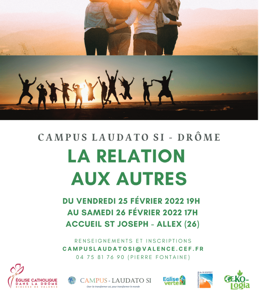 Après une année de rencontres mensuelles autour de trois spécialistes (politique, association et privé) d’une thématique en lien avec l’encyclique du Pape François Laudato Si’ tout est lié, le diocèse de Valence lance le Campus Laudato Si’, un programme de rendez-vous trimestriel d’une journée complète pour explorer et approfondir les quatre relations (à soi, aux autres, à la création, à Dieu). Le projet du campus Laudato Si’ est de réunir plusieurs dizaines de personnes pendant 24 heures en résidentiel, à l’Accueil St Joseph à Allex, pour se laisser transformer au travers de réflexions sur les 4 relations. Dans son encyclique Laudato Si’, le pape François propose un nouveau départ, il cherche à unifier les différents aspects de notre vie en montrant l’étroite interdépendance du rapport aux autres, à soi, à la création et au Créateur.
