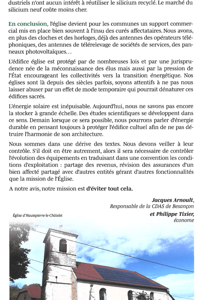Sabine me signale une intéressante mise au point, dans la revue diocésaine, sur le déploiement de panneaux solaires sur les églises, faite par l’économe du diocèse de Besançon