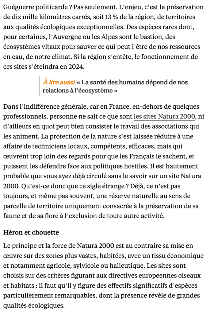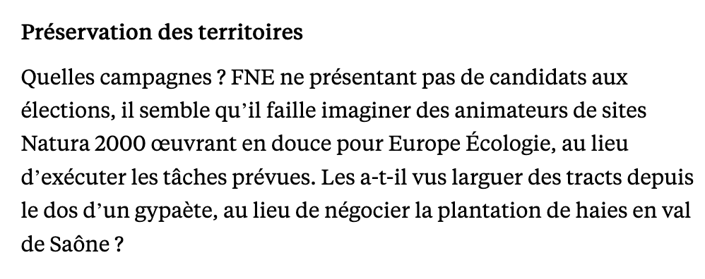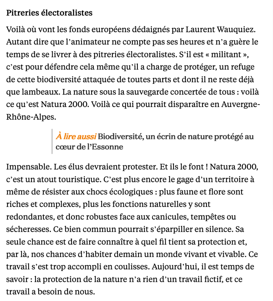 Il réagit ici à des décisions politiques locales qui visent à restreindre à privilégier une approche très libérale de la nature tout en sapant le travail des associations de terrain, si précieux pour suivre l’état des écosystèmes.