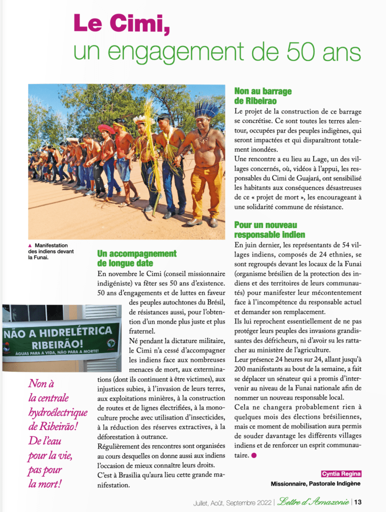 Le dernier numéro évoque le 50e anniversaire prochain du CIMI. C Conseil indigéniste missionnaire (CIMI) est un organisme mandaté par l’Église catholique brésilienne. Il accompagne les peuples indigènes dans leur lutte pour la survie, la protection de leurs terres et la dignité.