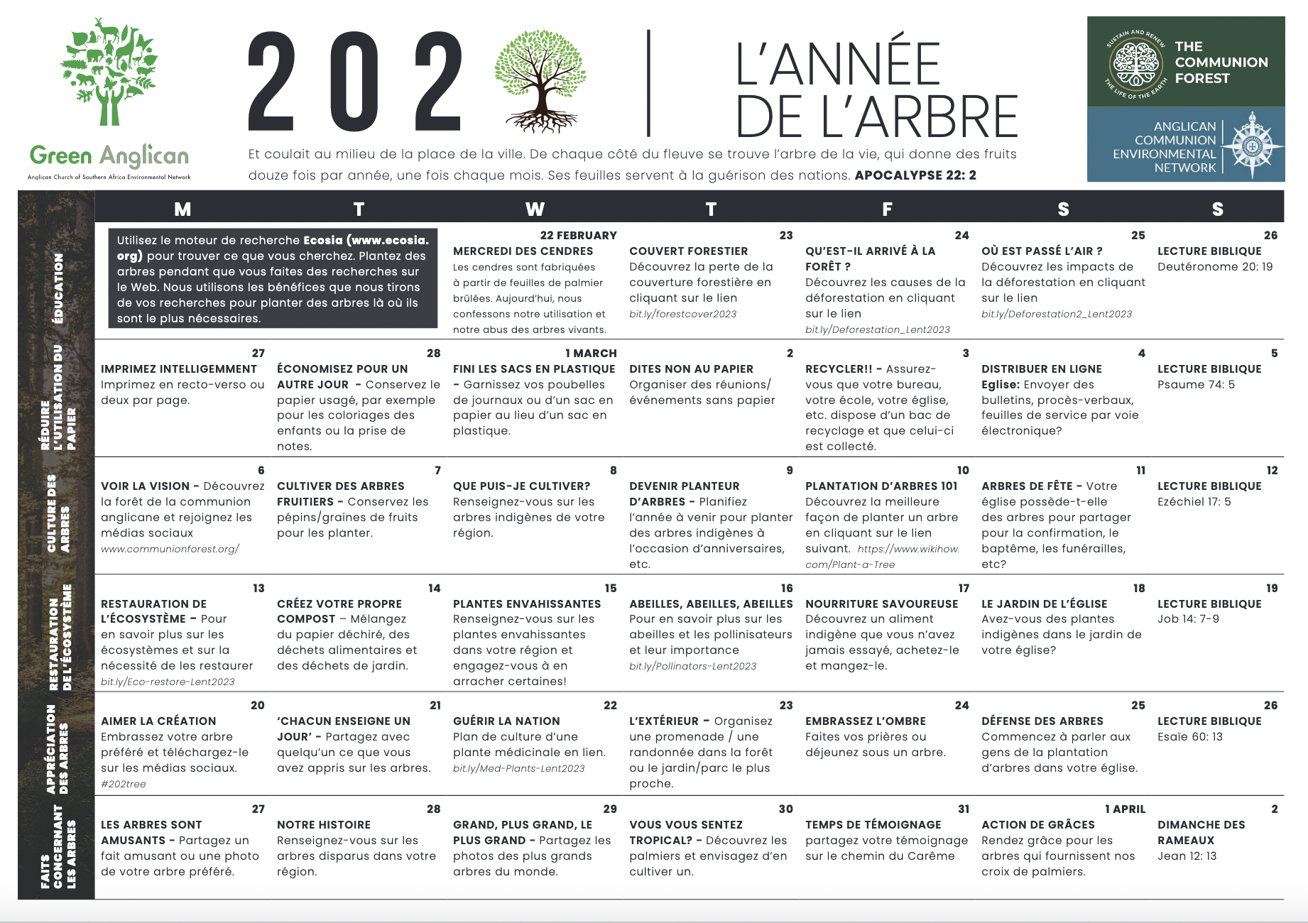 Est proposé aussi un outil nouveau, un autre « calendrier de Carême » qui aide à la mobilisation intérieure pour l’année 202tree (jeu de mot anglais qui assimile 3 (three) et l’arbre (tree)).
