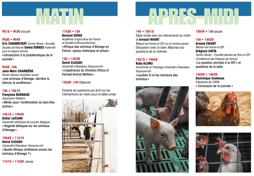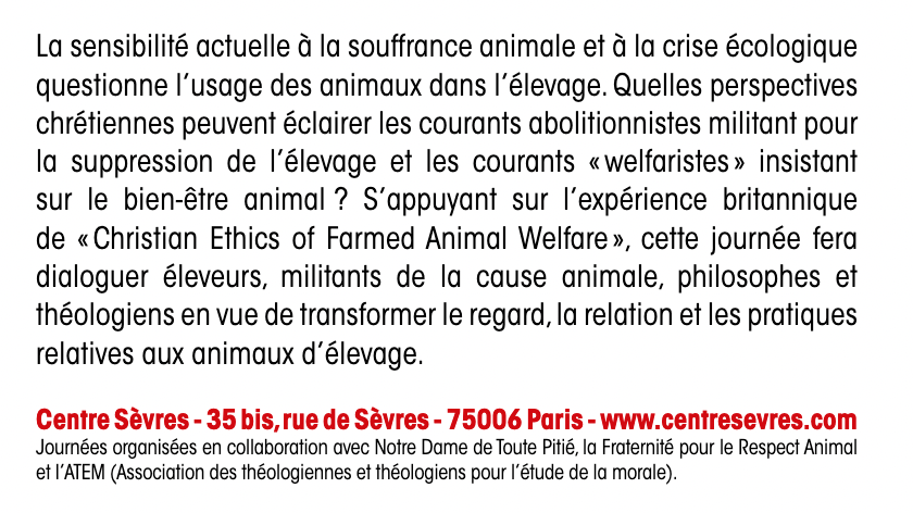 Estela nous rappelle la tenu du prochaine colloque sur la question des animaux d’élevage dans une perspective chréitenne qui se déroulera le 8 juin au Centre Sèvres à Paris.