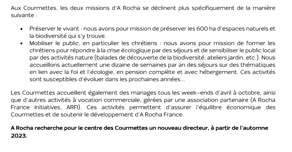 Les amis du Centre des Courmettes (au-dessus de Nice) du réseau A Rocha continuent à développer leur beau projet. Plusieurs postes sont à pourvoir