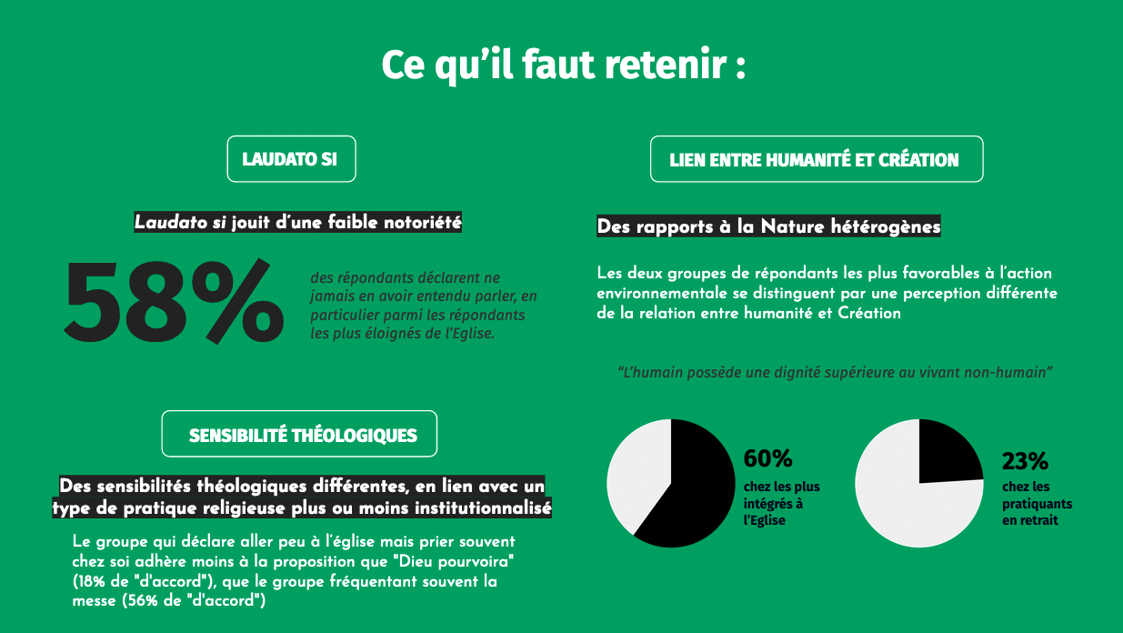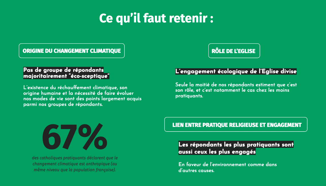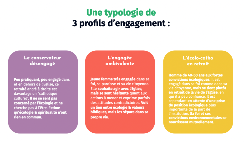 Une typologie en trois temps a été proposée à partir de cette étude : cathos culturels peu sensibles aux questions environnementales ; cathos plus pratiquants sans attachement fort et engagés sur ces questions d’écologie ; cathos engagés dans l’Eglise, plutôt féminin, très sensible aux questions écologiques mais un peu démunis pour s’y engager.