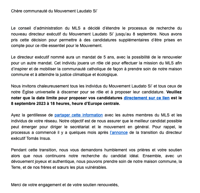 Le mouvement Laudato si (MLS), né après la publication de l’encyclique et la COP21 à Paris continue sa mission. Elle cherche actuellement un nouveau directeur exécutif. Des candidats ?