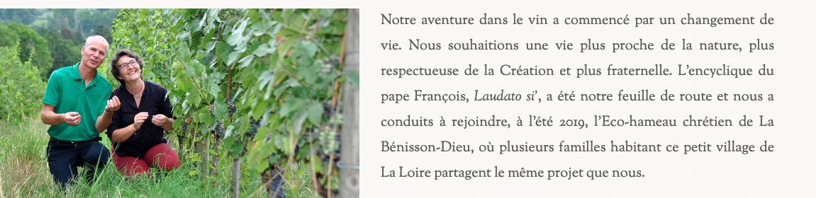 » Cette ancienne juriste et chancelière du diocèse de Nanterre et cet ancien rédacteur en chef d’Églises d’Asie, l’agence d’information des Missions étrangères de Paris, ont rejoint l’éco-hameau de la Bénisson-Dieu, dans la Loire, en 2019. Créé en 2016 dans le village éponyme, l’éco-hameau accueille aujourd’hui une dizaine de familles, qui souhaitent mettre en pratique l’écologie intégrale dans leurs métiers et leur quotidien. Le couple y a trouvé sa place en reprenant un domaine et ses vignes, à 15 km du village de la Bénisson-Dieu. Leur première cuvée « Laudato si’ » a été mise en bouteille en 2021. À l’annonce de la visite du pape à Marseille les 22 et 23 septembre, le couple s’est donc naturellement posé la question : « Pourquoi ne pas proposer nos vins comme vins de messe ? ». Après quelques échanges avec le cardinal Jean-Marc Aveline et le prêtre chargé de l’organisation de la célébration, le père Romain Louge, deux bouteilles de vin de grenache blanc, de la cuvée Grange de La Bénisson-Dieu 2021, ont été expédiées à Marseille. Et pour compléter leur colis, Aude-Reine et Régis ont ajouté deux autres bouteilles, cette fois de vin gouge, d’une cuvé appelée « Laudato si’ », en AOP Côte Roannaise, cette fois-ci pour être servies au déjeuner du Pape. »