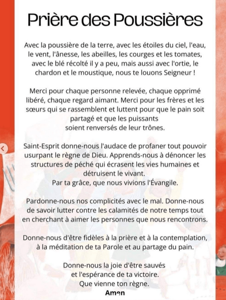 Dieu d’amour, Dieu Créateur, nous prions pour que tu nous rendes sensibles à ces gémissements et que tu nous encourages à avoir la même compassion que Jésus, le Seigneur Rédempteur. Donne-nous une vision renouvelée de notre relation avec la Terre et les uns avec les autres, comme créatures qui sont faites à ton image.