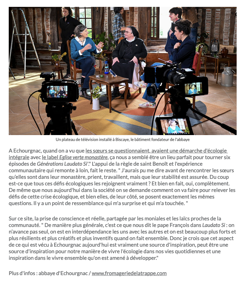 UNE ABBAYE POUR FAIRE DE LA TÉLÉ ? IL FALLAIT Y PENSER SURTOUT POUR PARLER ÉCOLOGIE INTÉGRALE. Pour le Jour du Seigneur (France 2), l’émission Générations Laudato si part sur le terrain pour déployer toutes les résonances de l’écologie intégrale. Elle a ainsi réalisé plusieurs épisodes de l’émission en s’installant dans l’abbaye d’Echourgnac. » On cherchait un lieu joyeux, un lieu où la question écologique et d’écologie intégrale était présente, était pensée, raconte Claire Riobé qui présente l’émission. On voulait vraiment se mettre à l’écoute des communautés religieuses et de celles qui avaient une sagesse centenaire, avec l’idée que dans l’Église il y a déjà toute une tradition sur les questions écologiques qui peut nous permettre d’avancer et de répondre aux défis d’aujourd’hui. (Art E&E Sept 2024)